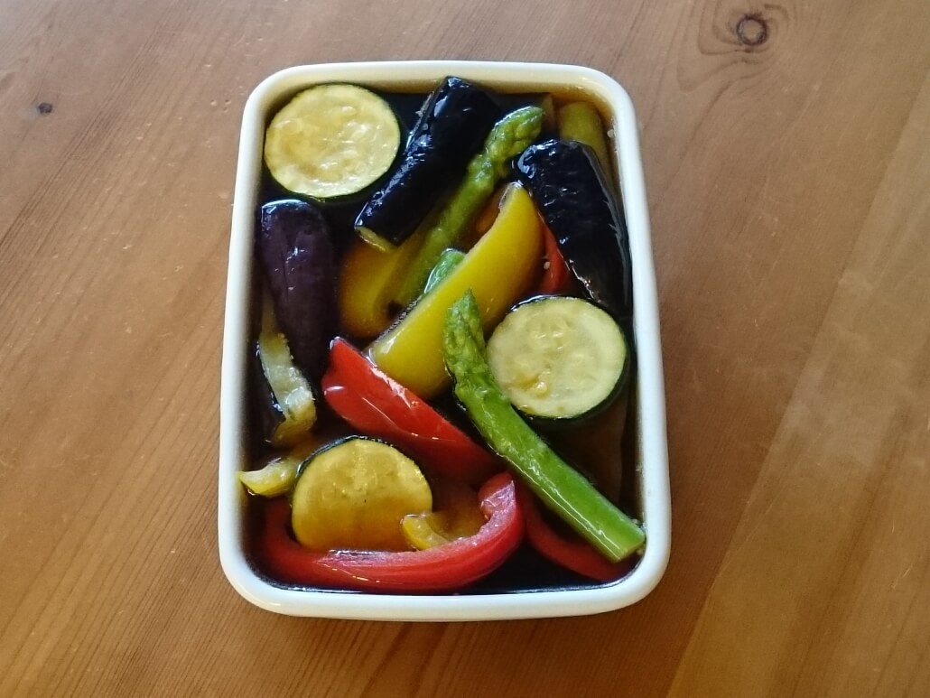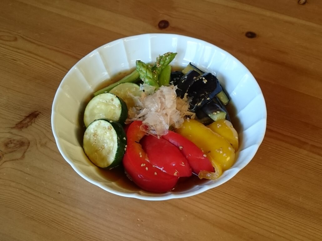 素揚げした夏の野菜を暑いうちにだし汁に漬けておくだけ。