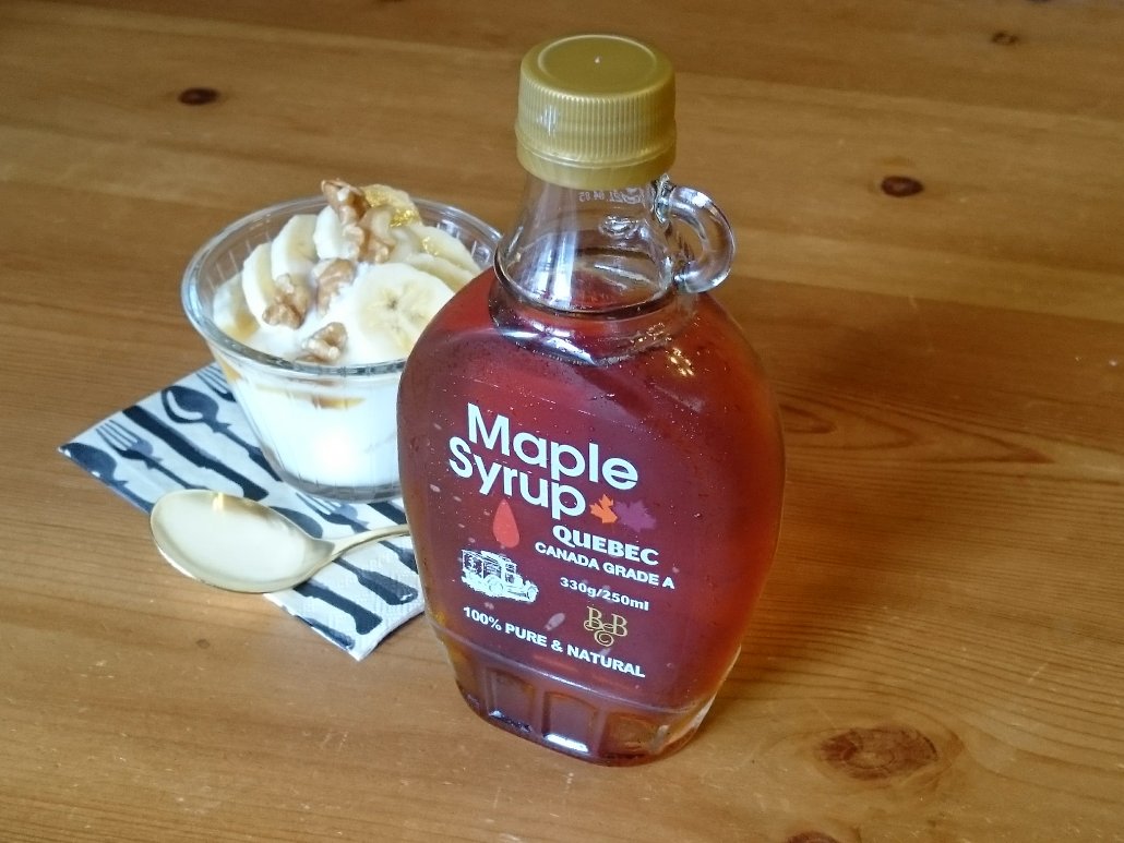 バナナにプレーンヨーグルトとメープルシロップをかけてくるみをトッピング。
