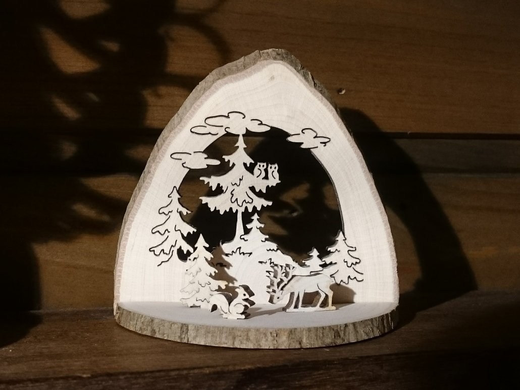 りすやトナカイ、ふくろうが森の中にいる様子が立体的に表現されています。