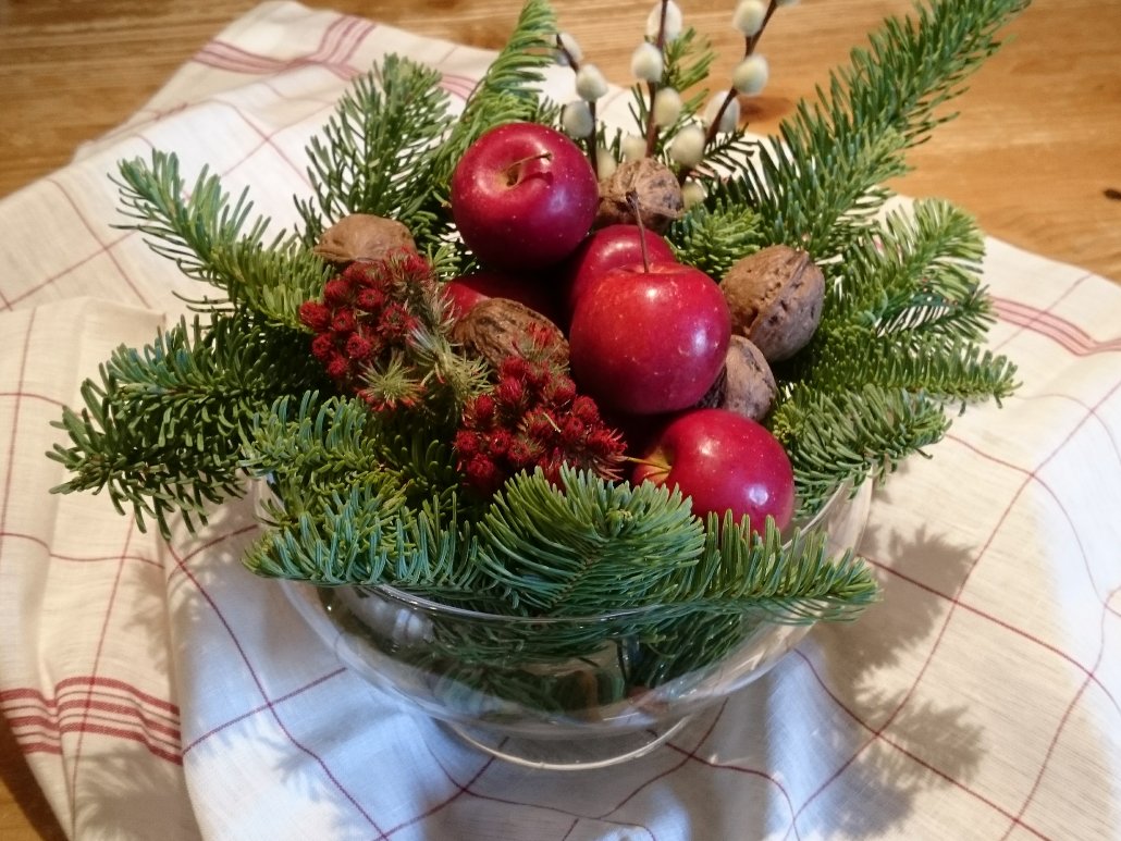 短めにカットしたもみの木や姫りんご、くるみなどを盛り付けて