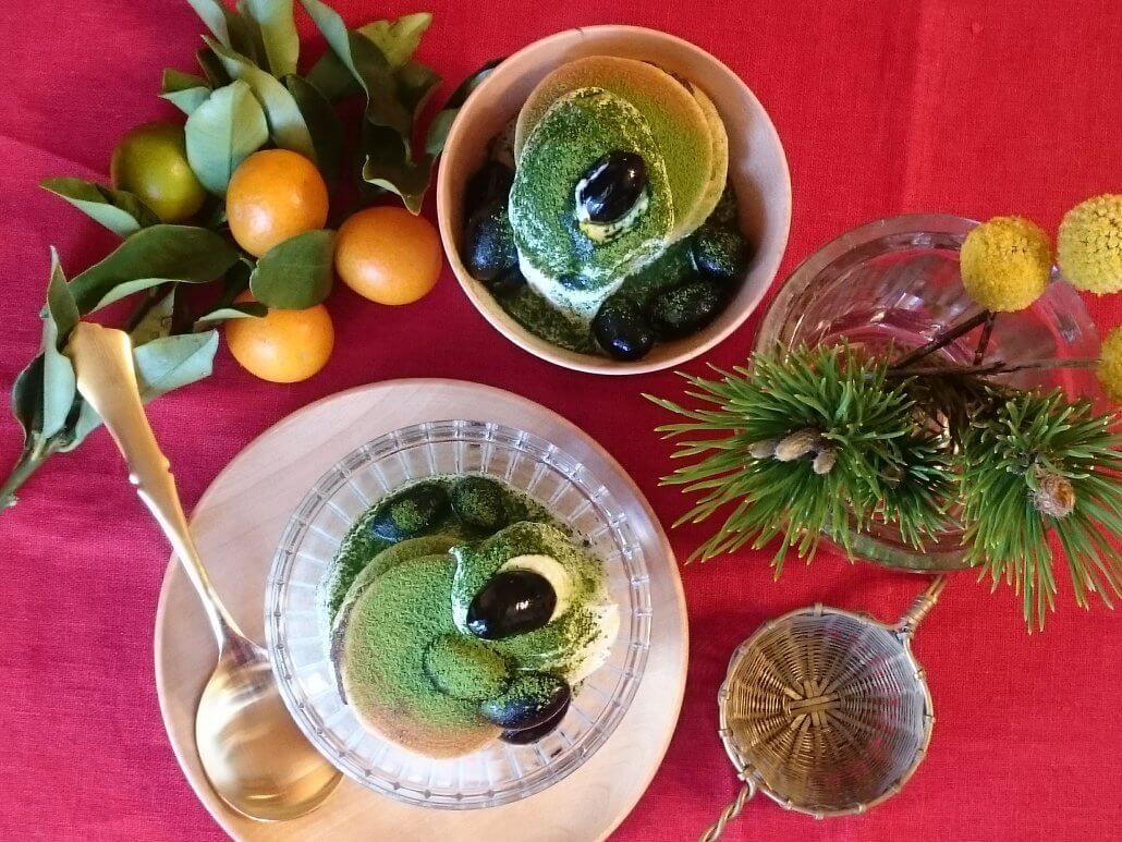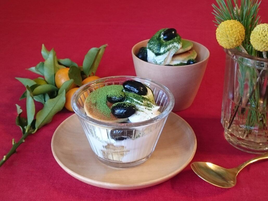 トライフルのように盛り付けて黒豆を飾ったら抹茶をかけて出来上がり。