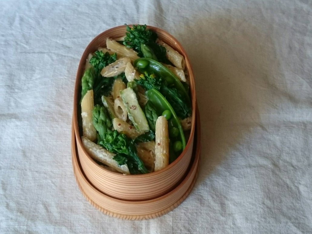 春野菜のクリームペンネも曲げわっぱに。