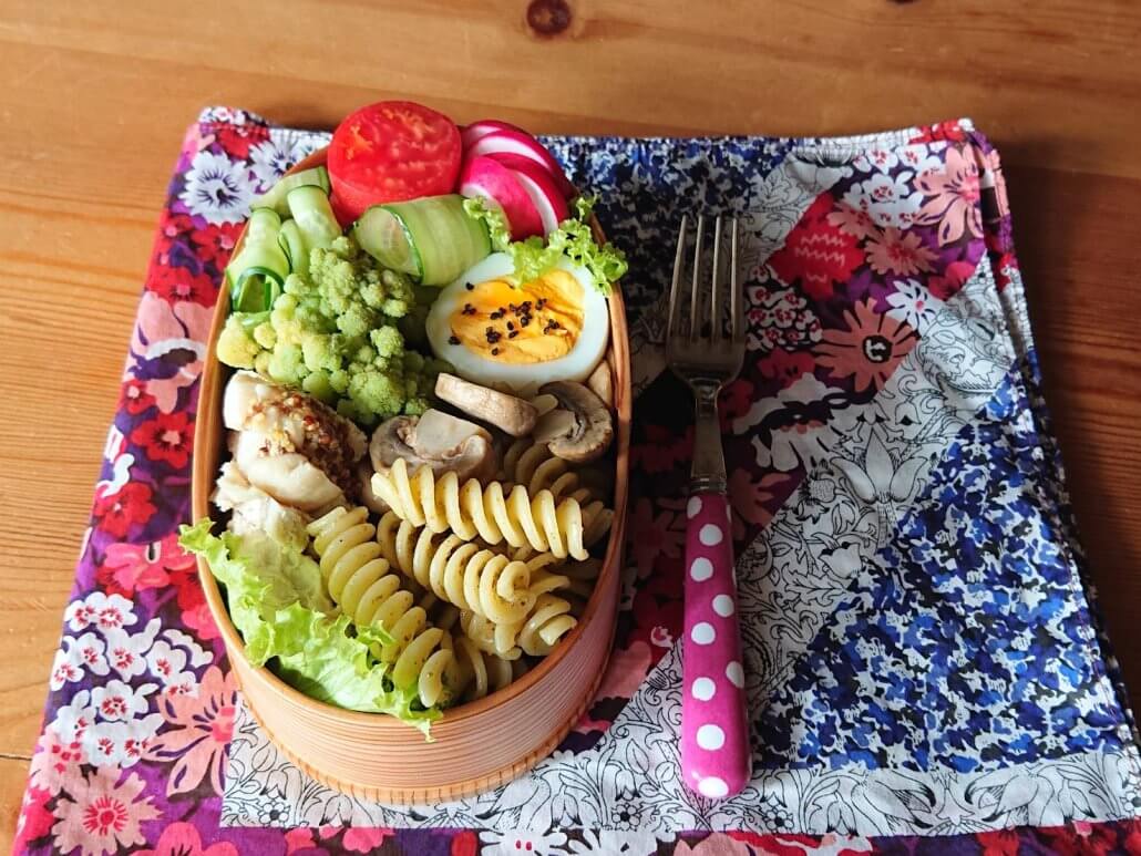 生野菜たっぷりのサラダパスタ弁当もわっぱに入れて。