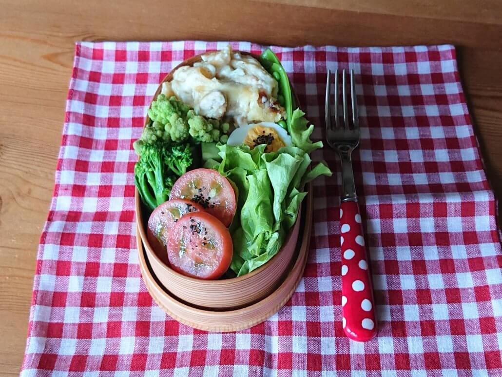 グラタン弁当もわっぱに。逆さにしなければ水分が漏れたりということもあまりありません。