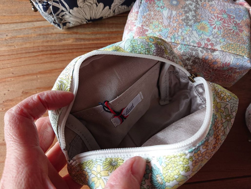 側面にはすぐに取り出せるティッシュがセットでき、中のポーチはキャンバス地の裏地が付いてとてもしっかりしたつくりです。