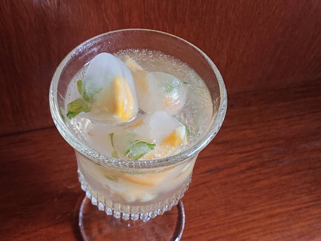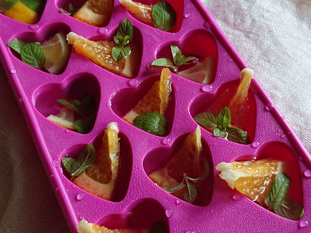 オレンジやレモンを小さくカットしてミントを添えて、ミネラルウォーターを注いで凍らせます。
