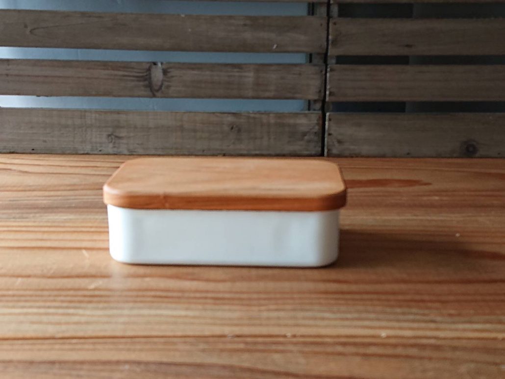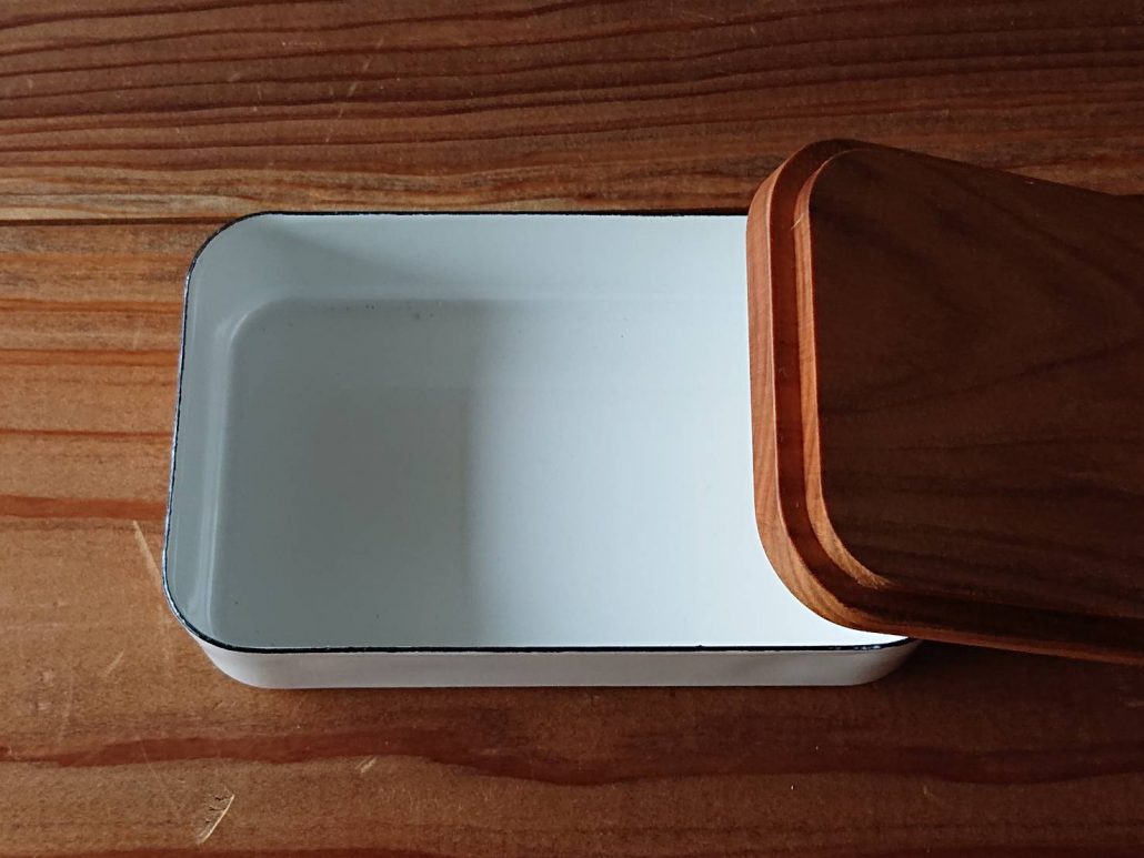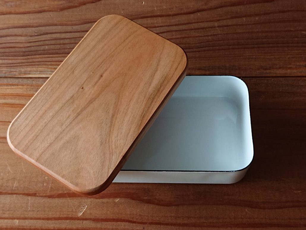 バターが入るケース部分は琺瑯製、蓋は桜の木で作られています。