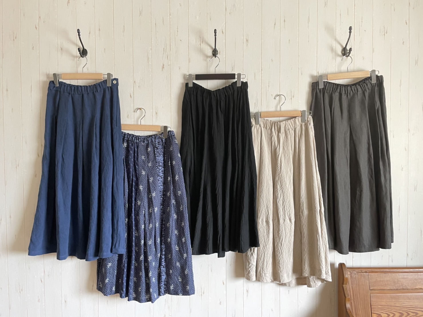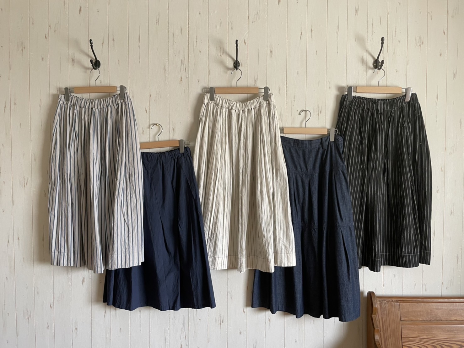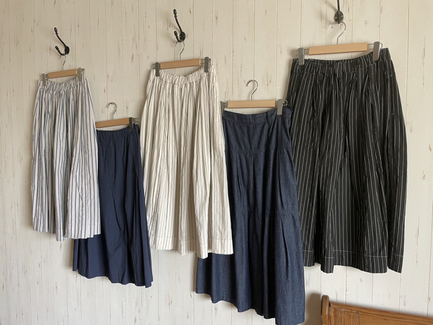 薄手のコットンやリネン、これからの季節、便利に着回しのできるスカートばかり。