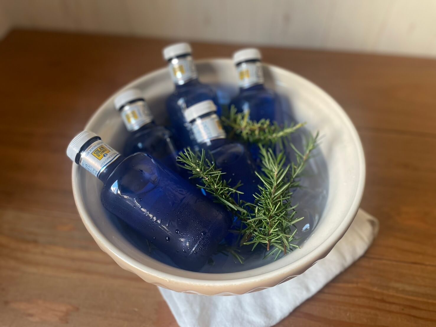 少しでも皆様にリラックスしていただければと思い、ミネラルウォーターを氷で冷やし、テラスのローズマリーを添えて、見た目も涼しく。