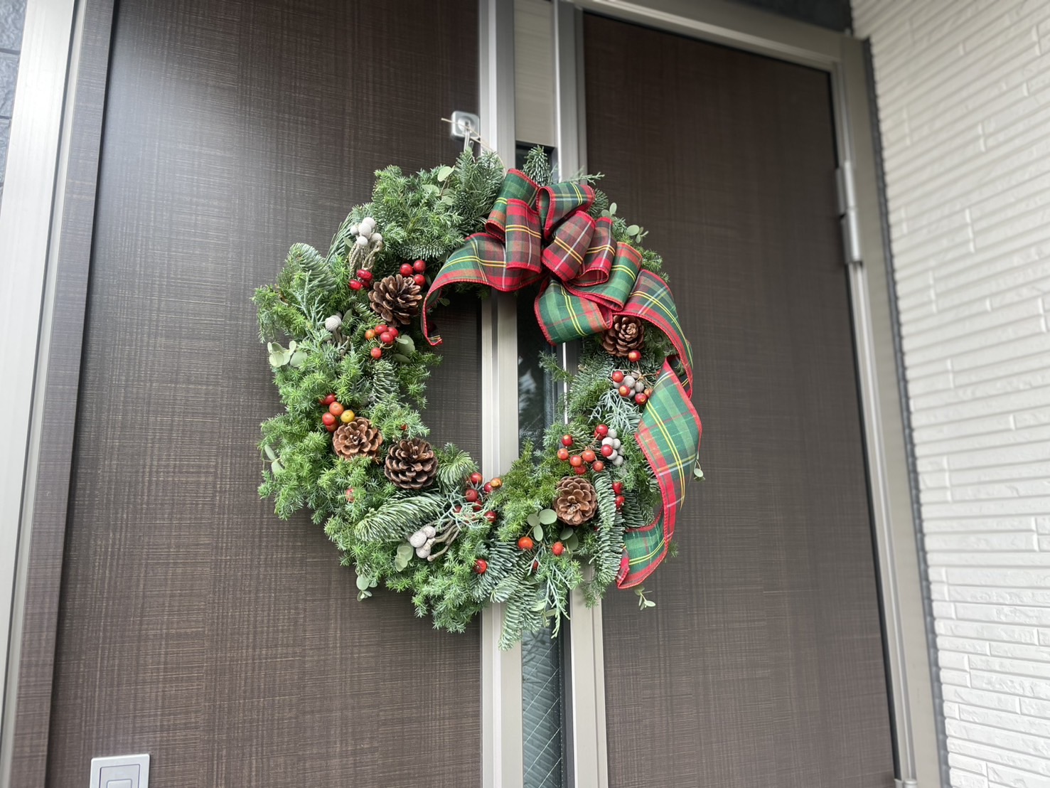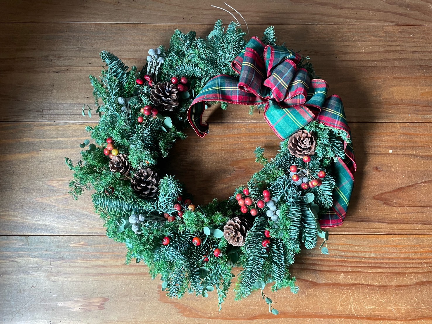 トラディショナルな深い赤のタータンチェックのリボンを結び、英国スタイルのリースになりました。