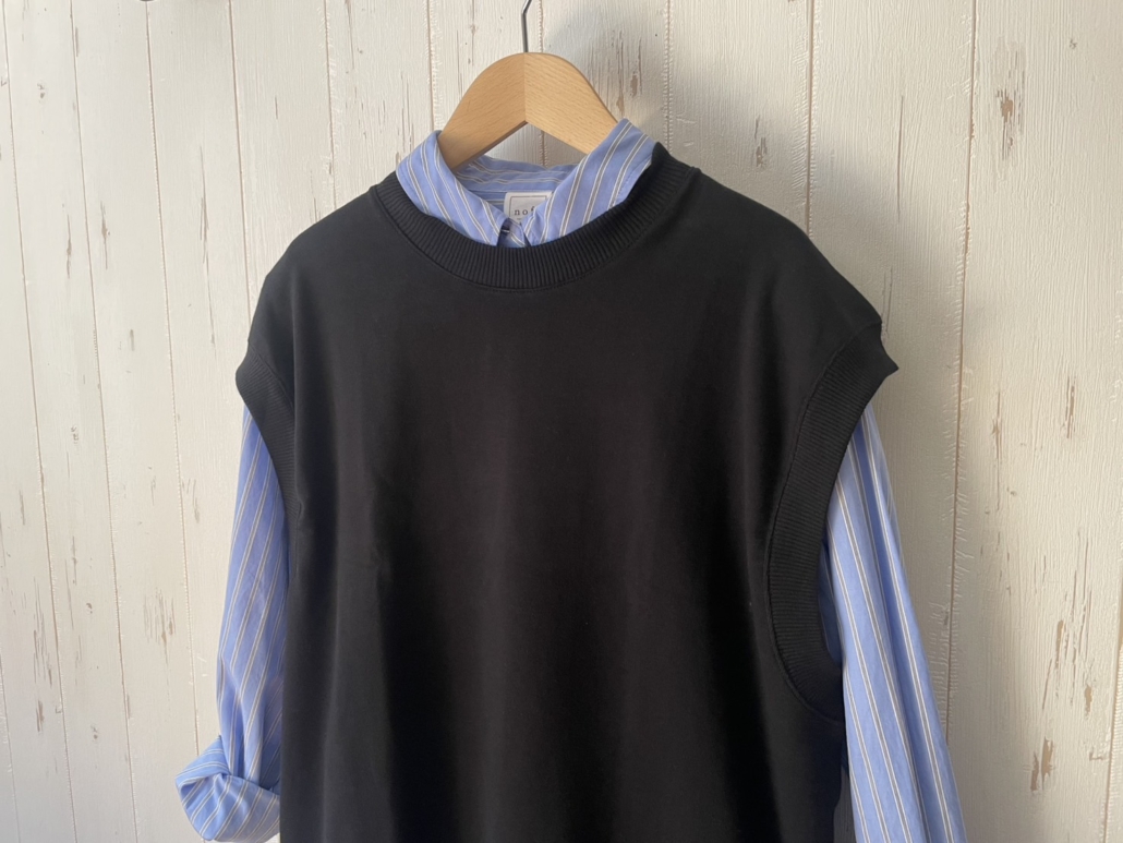 実はメンズのノースリーブニットなのですが、ゆったりとしたシルエットがちょうどよくベストとして着ることができます。