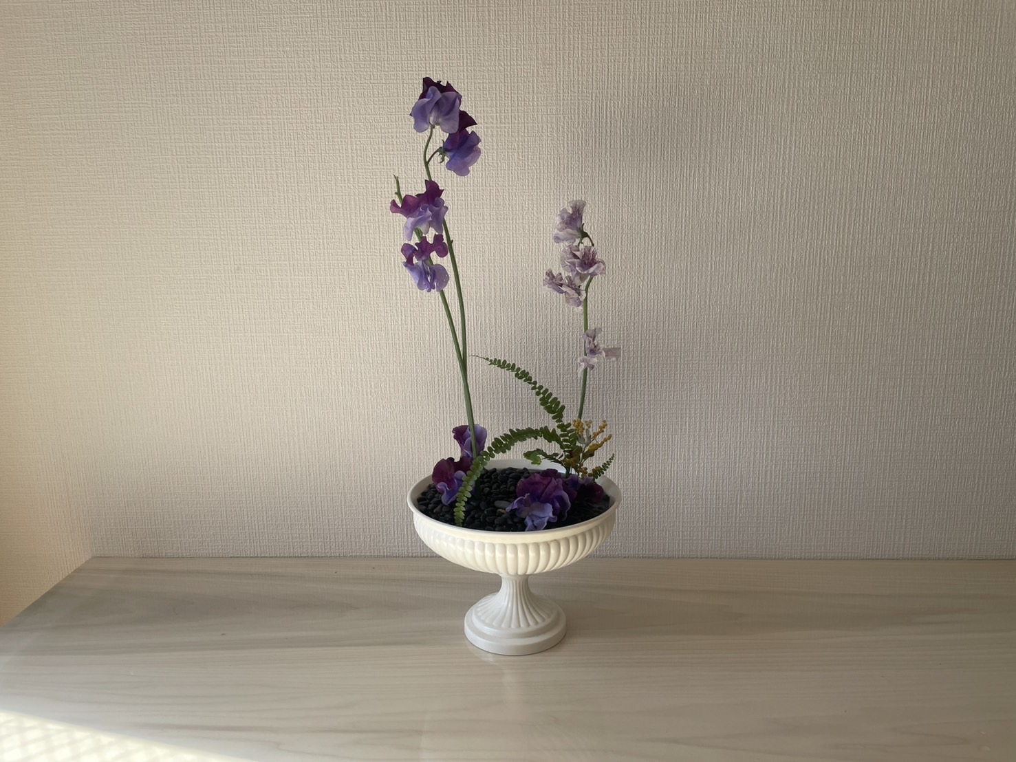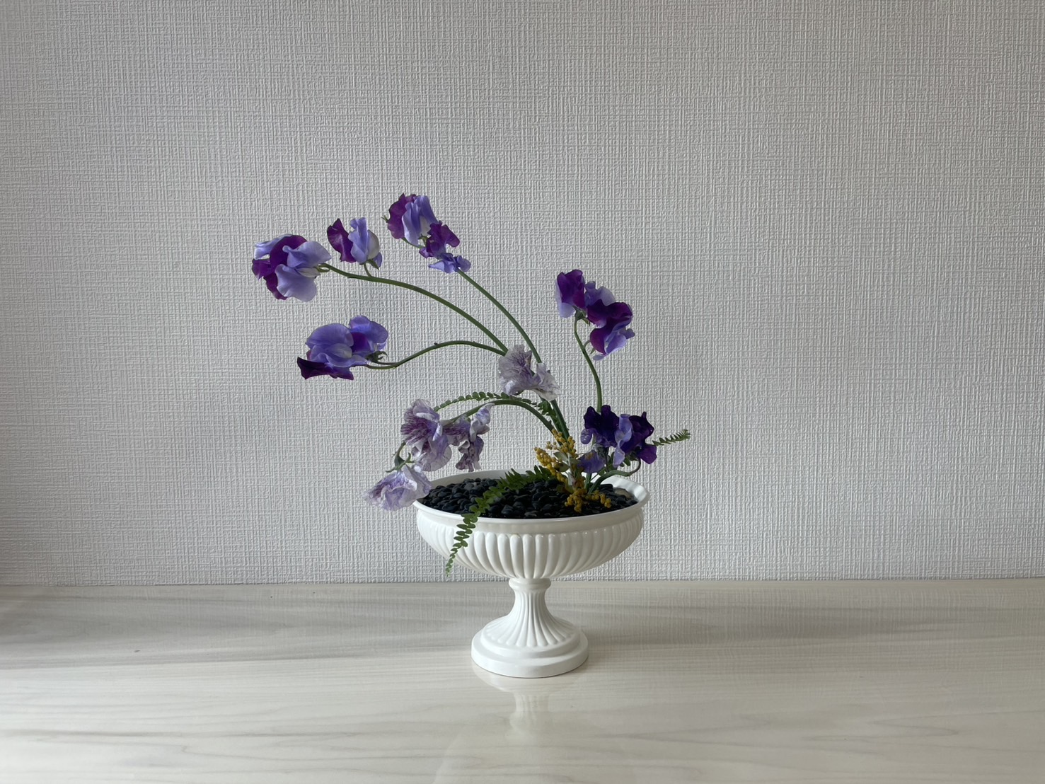 試作③先生のアドバイスにより、スイートピーをもっとたくさん使って流れるように。