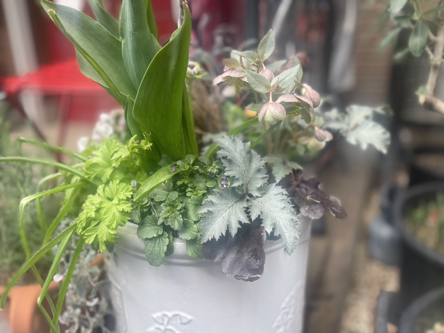 10月に参加したバラクライングリッシュガーデンの寄せ植え教室で作ったクリスマスローズが小ぶりでちょうど良い感じです。