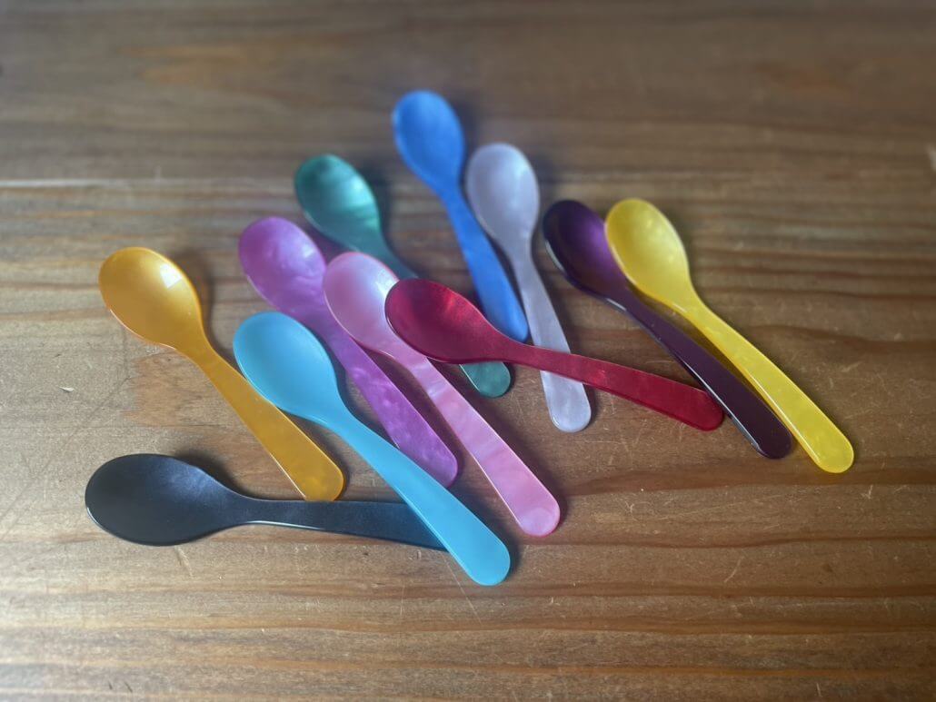 軽くて丈夫なアクリル素材(プレキシグラス®)のスプーンは、ひとつづつ職人さんが丁寧に7日間かけて磨き上げているそうです。