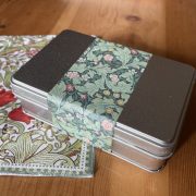 幅の広いウィリアムモリス柄のテープはカットする幅を変えて使うのも楽しいです。
