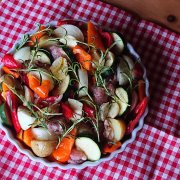 冷蔵庫にある中途半端に残っている野菜を適当に切ってお肉と並べてオリーブオイルとガーリック、ソルトペッパーで味付けしてオーブンかトースターへ。