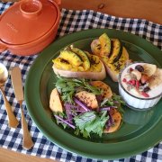 かぼちゃや柿を使いグリーンのプレートでハロウィンカラーの朝ごはん。