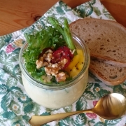 食感の良いくるみをトッピングしてパンを添えて簡単ランチの出来上がりです。