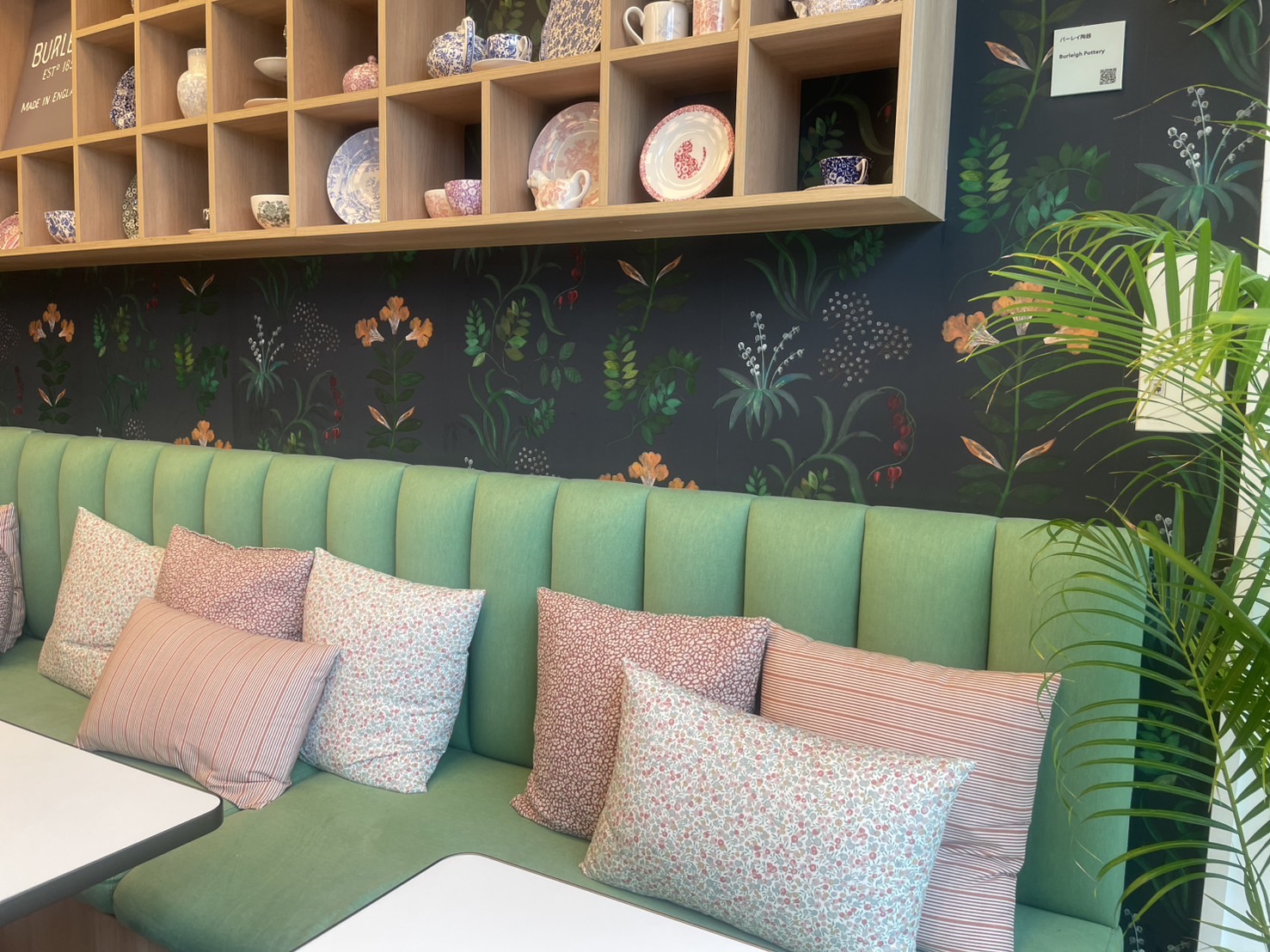 ソファー席のクッションの柄×柄の組み合わせ、壁紙のデザインなどやっぱり好きな感じのコーディネートでした。