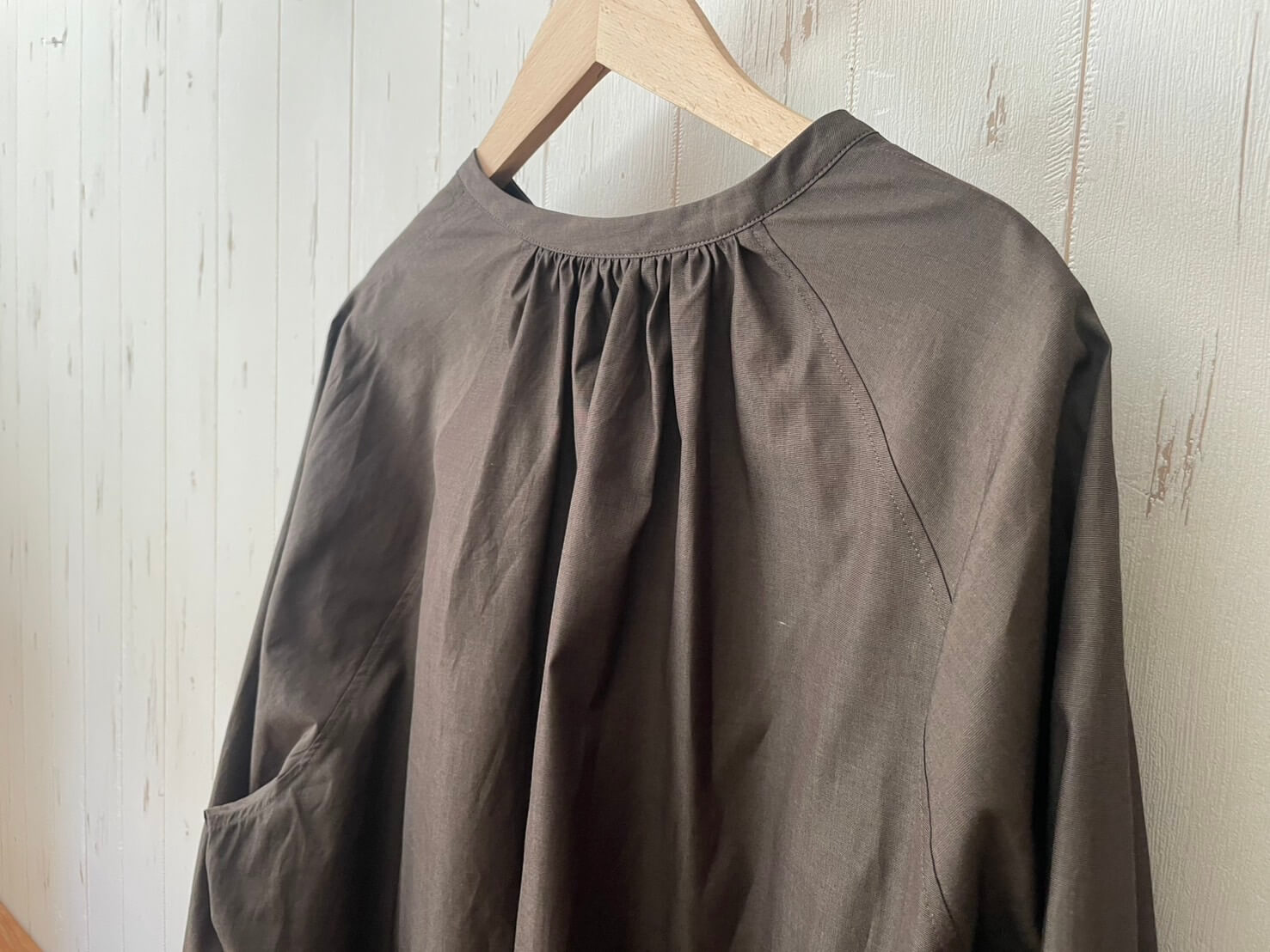 フロントと襟の付け根に細かいギャザーが入っており襟の抜け感とドロップショルダーの袖は絶妙なバランス。